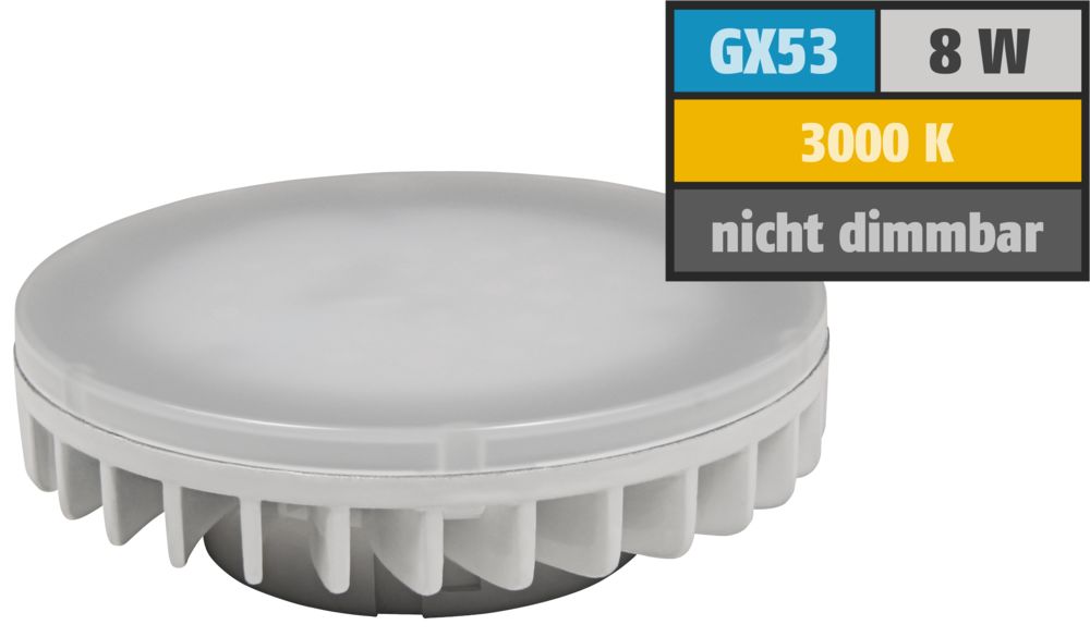 The article LED spotlight McShine ''LS-2166,6 cm ( 853 inch ), GX53, 8W, 800lm, Ø75x25mm, 120°, warm white is currently in stock