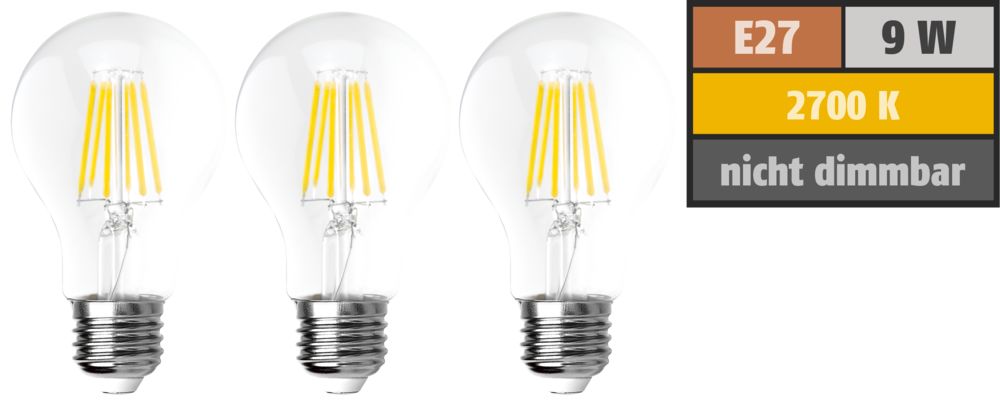 The article LED filament set McShine, 3x light bulb, E27, 9W, 1055lm, warm white, clear is currently in stock