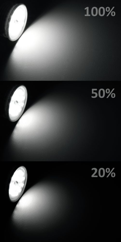 - dimmable via light switch: Starts with 100% -> 50% -> 20%