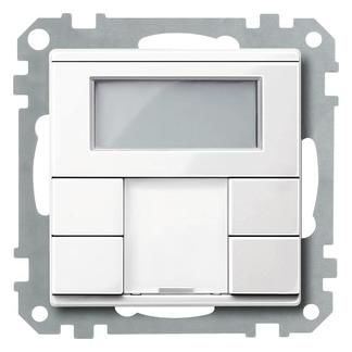 In the System M design. Comfortable control unit with 4 control buttons, operating and status display and label field. The operating display can also be used as an orientation light. With room temperature controller and display. With 5 red LEDs. The room temperature controller can be used for heating and cooling with continuously adjustable KNX actuators or for controlling switching actuators and heating actuators. With white backlit display to show e.g. time, date, temperature and operating mode. Menu for setting standard operating modes, setpoint, working day/non-working day (external control), display mode, time, switching times and brightness of the display. The buttons can be freely parameterized as a pair of buttons (two-surface) or as individual buttonsxx With integrated bus coupler. The bus is connected via a bus connection terminal. Software functions KNX functions Button switching, toggle, dimming, blinds (relative or absolute), edges trigger 1, 2, 4 or 8-bit telegrams (distinction between short/long operation). Edges with 2-byte telegrams (distinction between short/long operation), 8-bit slider, scene recall, scene storage, lock function, time control with synchronization, reporting function. Cyclic reading of external temperature value, fan control, operating modes, setpoint shift. Room temperature controller functions Controller type 2-point control, continuous PI control, switching PI control (PWM). Output Continuous in the range 0-100% or switching ON/OFF. Controller mode -Heating with one controller output. Cooling with one controller output. Heating and cooling with separate controller outputs. Heating and cooling with one controller output. 2-stage heating with 2 controller outputs. 2-stage cooling with 2 controller outputs. 2-stage heating and cooling with 4 controller outputs. Operating modes comfort, comfort extension, standby, night reduction, frost/heat protection. Shifting of all setpoints. Saving of all setpoint temperatures and operating modes on reset. Monitoring of external temperature. Additional output of the control variable as a 1-byte value with PWM. Reporting function for actual temperature, valve protection functionxx scene function. Operation menu. Scope of delivery With bus connection terminal and support plate. With screw for dismantling protection. With plaster protection cover. Material: brilliant thermoplastic. Color: glossy polar white.