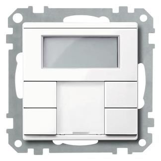 2-way push button sensor plus with room temperature controller. For System M. Convenient operating unit with 4 operating buttons, operating and status display and label field. The operating display can also be used as an orientation light. With room temperature controller and display. With 5 red LEDs. The room temperature controller can be used for heating and cooling with continuously adjustable KNX valve drives or for controlling switching actuators and heating actuators. With the white backlit display to show e.g. time, date, temperature and operating mode. Menu for setting standard operating modes, setpoint, working/non-working day (external trigger), display mode, time, switching times and brightness of the display. The buttons can be freely parameterized as button pairs (two-surface) or as individual buttons. With integrated bus coupler. The bus connection is made via a bus connection terminal. Functions of the push buttons: Switching, toggle, dimming, blind control (relative or absolute), pulse edges trigger 1-, 2-, 4- or 8-bit telegrams (differentiation between short and long operation). Pulse edges with 2-byte telegrams (differentiation between short and long operation), 8-bit linear controller, scene recall, scene storage, locking functions. Time control with synchronization, notification functions, cyclical reading of external temperature values, fan control, operating modes, setpoint shift. Functions of the room temperature controller: Controller type: 2-point control, continuous PI controller, switching PI controller (PWM). Output: continuous in the range 0 to 100% or switching ON/OFF. Controller operating mode: Heating with one controller output. Cooling with one controller output. Heating and cooling with separate controller outputs. Heating and cooling with one controller output. 2-stage heating with 2 control outputs. 2-stage cooling with 2 control outputs. 2-stage heating and cooling with 4 control outputs. Operating modes: comfort, comfort extension, standby, night reduction, frost/heat protection. Shifting of all setpoints, saving of all setpoint temperatures and operating modes on reset, external temperature monitoring, additional output of the control variable as a 1-byte value on the PWM. With bus connection terminal and holding plate. Screw to protect against dismantling. With protective cover for plaster. Material: Thermoplastic glossy material, antibacterial. Color: similar to RAL 9016. Color: active white, glossy.