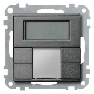 2-way push button sensor plus with room temperature controller. For System M. Convenient operating unit with 4 operating buttons, operating and status display and label field. The operating display can also be used as an orientation light. With room temperature controller and display. With 5 red LEDs. The room temperature controller can be used for heating and cooling with continuously adjustable KNX valve drives or for controlling switching actuators and heating actuators. With the white backlit display to show e.g. time, date, temperature and operating mode. Menu for setting standard operating modes, setpoint, working/non-working day (external trigger), display mode, time, switching times and brightness of the display. The buttons can be freely parameterized as button pairs (two-surface) or as individual buttons. With integrated bus coupler. The bus connection is made via a bus connection terminal. Functions of the push buttons: Switching, toggle, dimming, blind control (relative or absolute), pulse edges trigger 1-, 2-, 4- or 8-bit telegrams (differentiation between short and long operation). Pulse edges with 2-byte telegrams (differentiation between short and long operation), 8-bit linear controller, scene recall, scene storage, locking functions. Time control with synchronization, notification functions, cyclical reading of external temperature values, fan control, operating modes, setpoint shift. Functions of the room temperature controller: Controller type: 2-point control, continuous PI controller, switching PI controller (PWM). Output: continuous in the range 0 to 100% or switching ON/OFF. Controller operating mode: Heating with one controller output. Cooling with one controller output. Heating and cooling with separate controller outputs. Heating and cooling with one controller output. 2-stage heating with 2 control outputs. 2-stage cooling with 2 control outputs. 2-stage heating and cooling with 4 control outputs. Operating modes: comfort, comfort extension, standby, night reduction, frost/heat protection. Shifting of all setpoints, saving of all setpoint temperatures and operating modes on reset, external temperature monitoring, additional output of the control variable as a 1-byte value on the PWM. With bus connection terminal and carrier plate. Screw for dismantling protection. With protective cover for plaster. Material: Thermoplastic, elegant matt. Color: anthracite.