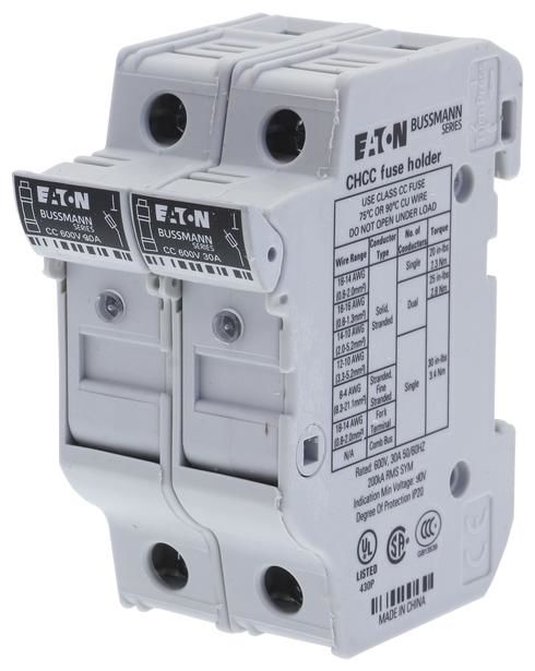 We offer you Moeller CHCC2DIU EATON fuse holder Nsp. 30A AC 600V 10x38mm CC 2p UL with code. always at the best possible price. We can give you a discount of 2% on Moeller CHCC2DIU EATON fuse holder Nsp. 30A AC 600V 10x38mm CC 2p UL with code. if you choose payment in advance on ordering.