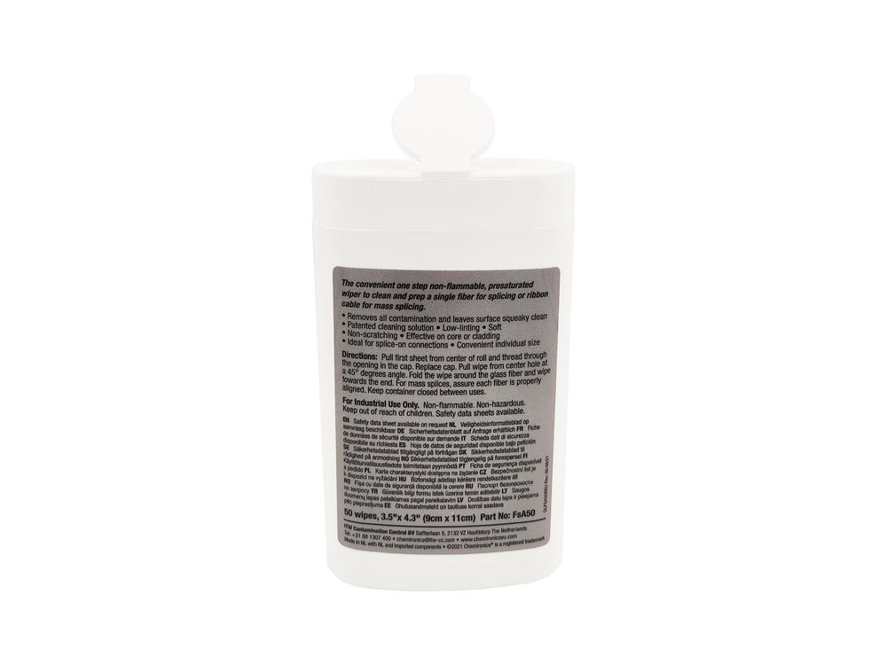The Chemtronics wet cleaning wipes FSA-50 are the practically packaged wipes for a variety of applications. They are available as pre-soaked wipes with an aqueous cleaning solution, soft, low-lint and perfect for cleaning small areas. They are particularly suitable for cleaning glass fibers before the fusion splicing process or connector assembly.