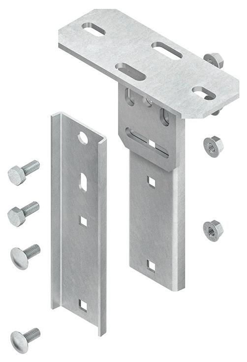 head plate with joint, parallel to the profile, the production of suspended supports system I 80 / ..., for assembly on sloping ceilings or steel profiles with a vertical orientation of max. + 50Ø, Hot-dip galvanized to DIN EN ISO 1461, including hot-dip galvanized plate connector pair and share a moderate dip galvanized mounting accessories.
