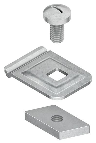 barrier strip fastening clamp for fastening of barrier strips in cable ladders with rungs of slot width 11 mm, galvanized to DIN EN 10346, including galvanized sliding nut GSM 306 and screw M 6x12 DIN EN ISO 1580. NIEDAX Model No.: KLWC 11th Type: KLWC11