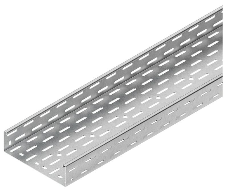Cable tray according to DIN EN 61537, heavy, with staggered bottom and side perforation, galvanized to DIN EN 10346, including one-piece U-shaped joint connector RV 60 .. and share moderate fixing accessories.