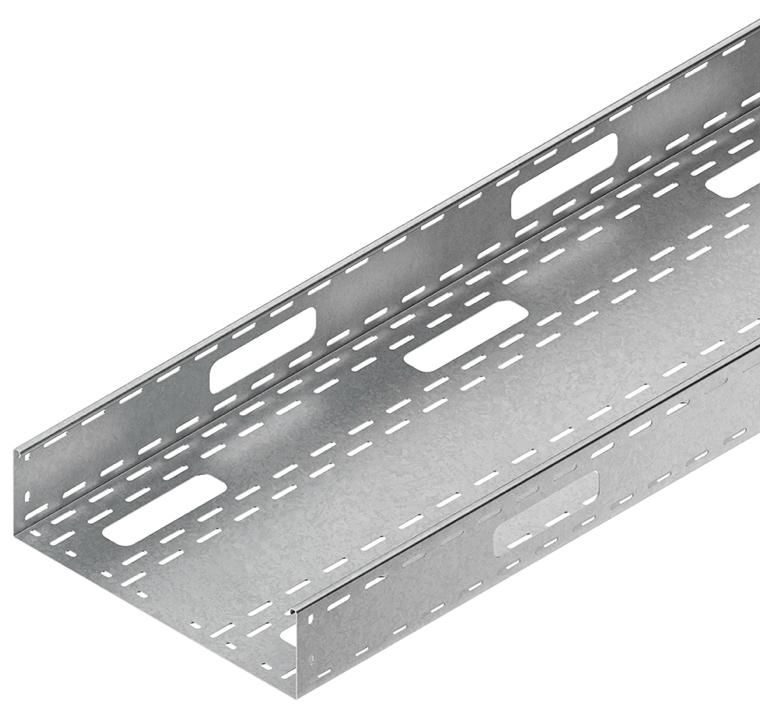 Distribution cable tray according to DIN EN 61537, with staggered sides and perforated base, as well as cable outlets from 40 x 150 mm, hot-dip galvanized to DIN EN ISO 1461, including dip galvanized one-piece U-shaped joint connector, RV 110 .. F and dip galvanized share moderate fixing accessories.
