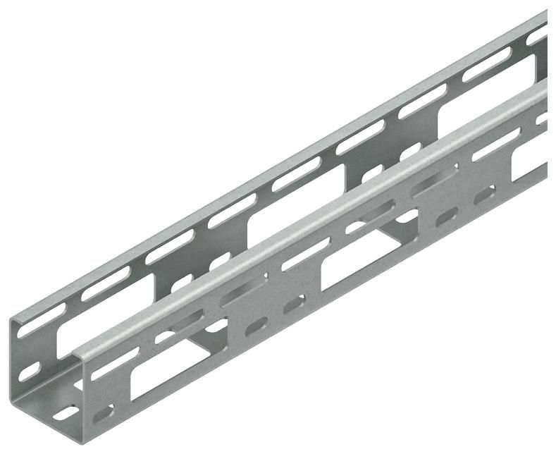 splitter cable channel DIN EN 61537, with staggered sides and perforated base, as well as cable outlets in the bottom of 30 x 65 mm and in the pages of 20 x 65 mm, galvanized to DIN EN 10346, 2 joint connector RVV 50 per joint to be ordered separately. Dimensions H x W: 50 x 50 mm