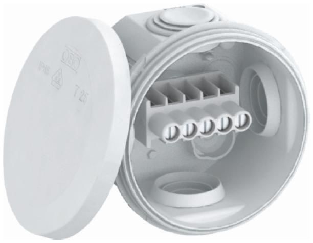 Cable junction box in accordance with DIN EN 60670. Flame-retardant in accordance with DIN EN 60695-2-11, test temperature 650°C. Impact resistance IK07 in accordance with DIN EN 50102.