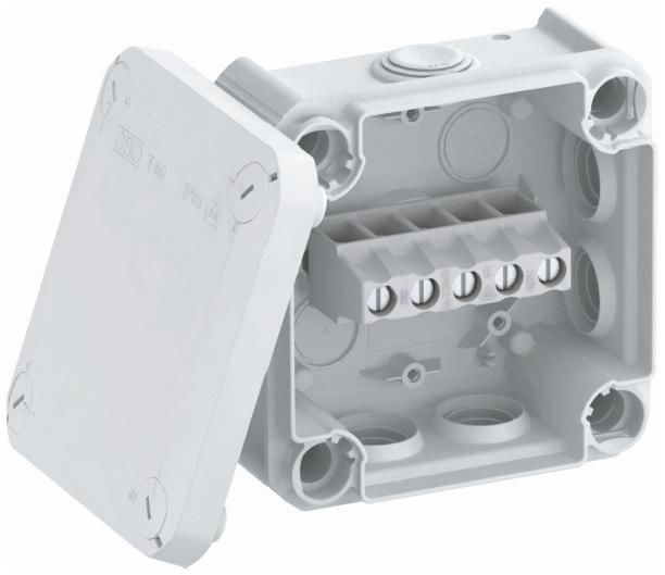 Cable junction box in accordance with DIN EN 60670. Flame-retardant in accordance with DIN EN 60695-2-11, test temperature 650°C. Impact resistance IK07 in accordance with DIN EN 50102.