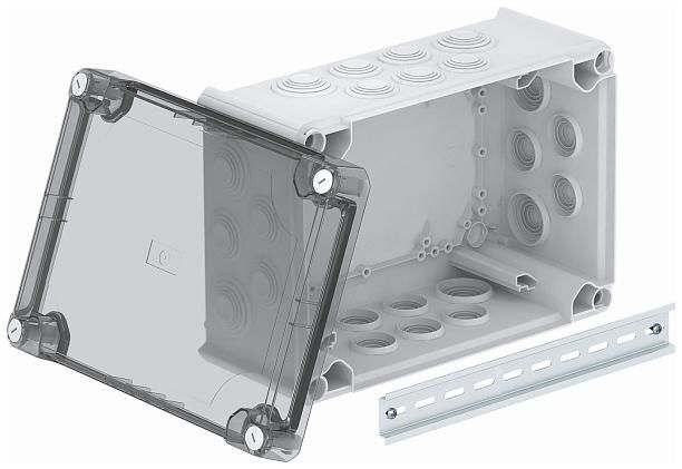 Cable junction box in accordance with DIN EN 60670. Flame-retardant in accordance with DIN EN 60695-2-11, test temperature 650°C. Impact resistance IK05 in accordance with DIN EN 50102.