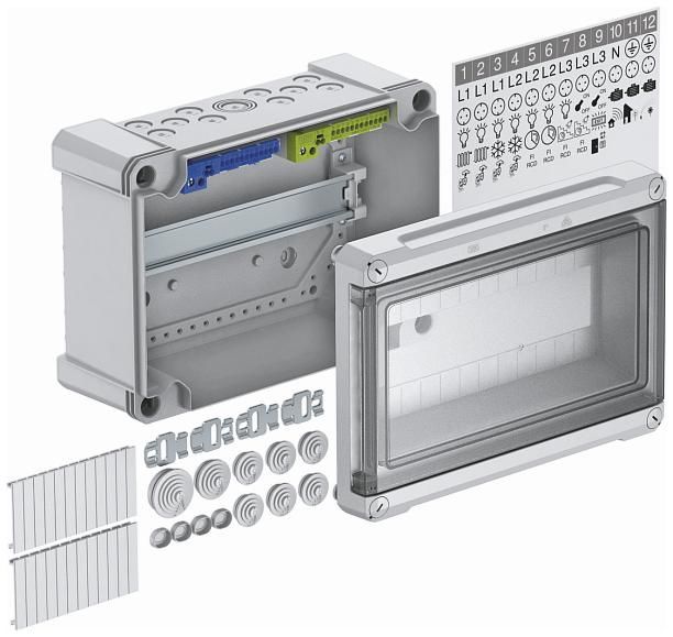 - terminal block set consisting of: one PE/N terminal each (1x25 mm² and 1x16 mm² screw terminals, 2x4 mm² and 12x2.5 mm² plug-in terminals), mini top-hat rail, assembly instructions and fastening kit