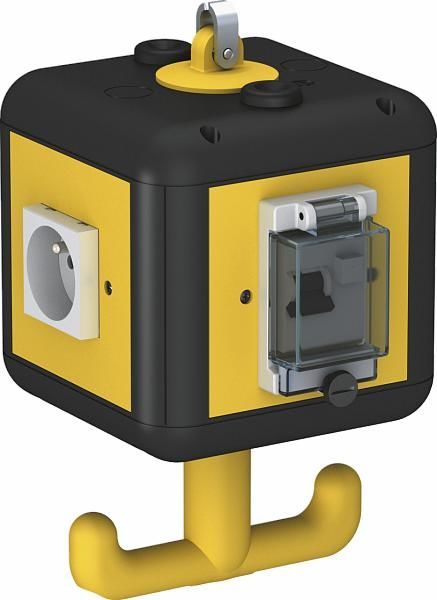 2 x 1-way sockets 16 A/250 V with increased contact protection, pre-wired to an alternating current circuit, connection via 1 x 3-pin terminal, with partition for circuit separation and a residual current device (RCD).