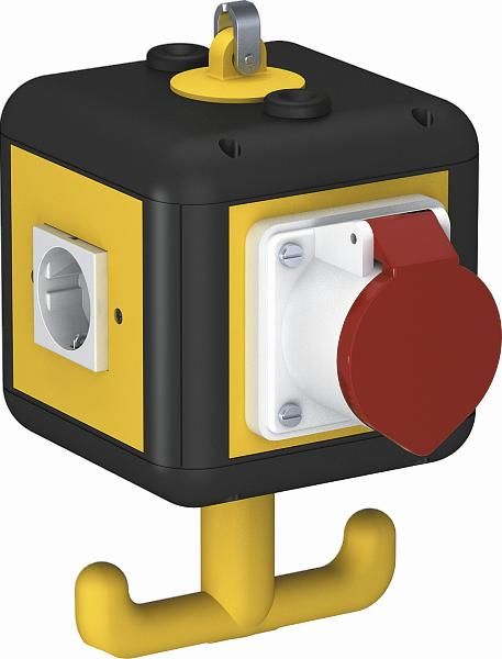Through a perforated partition the individual current types or circuits can be closed off against each other. Power is supplied via two grommets (with strain relief for cables up to Ø 14 mm) next to the hanging loop in the case. Color combination of yellow / black in accordance with VBG 125 (safety signs at work).