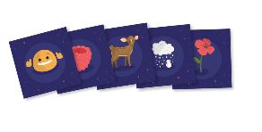The set includes:6 forest symbols: wild boar, deer, boletus, raspberry, pine and poplar 6 grey mouse symbols 7 emotion symbols: joy, sadness, anger, disgust, approval, rejection and joy 7 obstacle symbols: asteroids 5 colourful planet symbols: red, green, yellow, blue, purple 4 bus symbols with a set of printed symbols 4 flower symbols: dandelion, cornflower, chamomile and poppy 4 weather symbols: sun, rain, storm, snow Size10x10cm