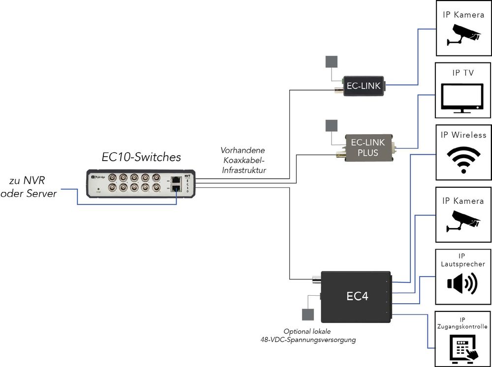 NVT Phybridge Switch CLEER PoE over Coax EC-Base: Long Reach PoE++ Extender