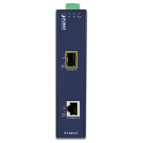 The PLANET IFT-80xT Series is an industrial-grade media converter line that bridges copper-based 10/100Base-TX connections with 100Base-FX fiber links. It is ideal for industrial environments, providing a fiber reach of up to 2 km (IFT-802T), 15 km (IFT-802TS15), or 20 km (IFT-805AT with SFP module), depending on the model and fiber type.