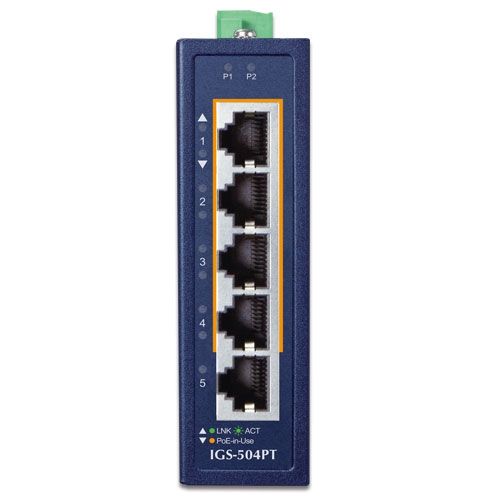 The PLANET IGS-504PT is the smallest industrial 4-Port PoE+ switch in the PLANET lineup, specifically built for space-constrained industrial environments. With four 802.3at PoE+ ports and one uplink port, it delivers up to 120W total PoE power budget and full Gigabit performance in challenging conditions ranging from -40 to 75 °C.
