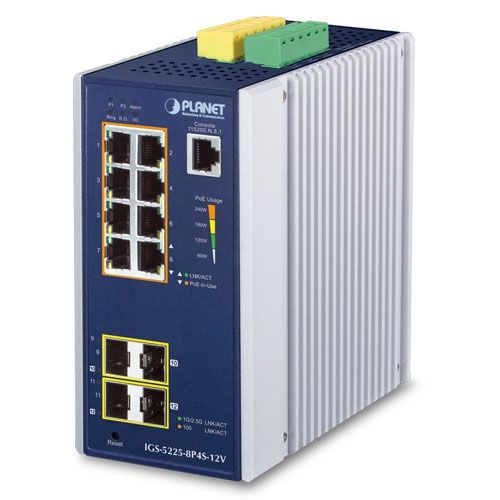 The PLANET IGS-5225-8P4S-12V is a rugged L2+ industrial managed switch featuring 8 PoE+ Gigabit ports, two 100/1000BASE-X SFP and two 100/1000/2500BASE-X SFP ports. Powered by 12–54V DC input and internal boost circuitry, it eliminates the need for special PoE power supplies. With advanced management, Layer 3 static routing, ERPS ring support, and intelligent PoE functions (Alive Check, PoE Scheduling), it's an ideal switch for surveillance, factory automation, and remote site deployment.