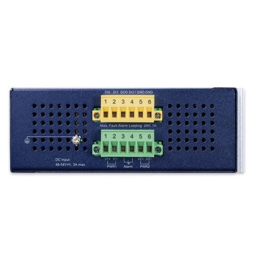 - 6-pin removable terminal block (Pin 1/2 Power 1, 3/4 Alarm, 5/6 Power 2)