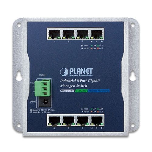 The PLANET WGS-4215-8T is an 8-port Gigabit Ethernet Layer 2 managed switch, built with a rugged, fanless IP30-rated metal housing and designed specifically for wall-mounted applications in tight spaces such as enclosures and industrial cabinets. With dual power inputs (12~48V DC or 24V AC), rich Layer 2 features, robust security, and support for IPv6, the WGS-4215-8T is a cost-effective solution for IoT networks, building automation, surveillance, and other industrial applications.