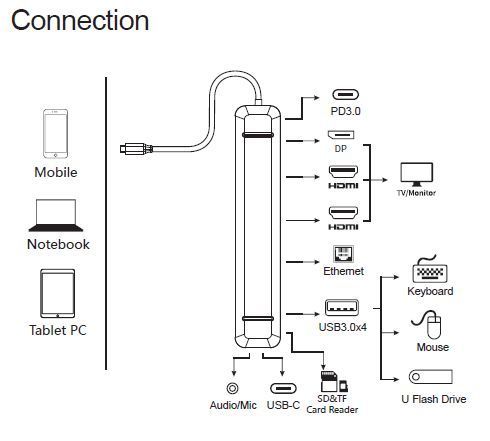 All the important ports for your computer/laptop are combined in the simple and elegant Plusonic docking station. The adapter expands your laptop with 9 additional functions such as a micro SD card slot, an SD card slot, a USB-C PD3.0 port with max. 100W power, 2x 4K HDMI, 1x DP, four USB 3.0-A Connections, 3.5mm jack port, a USB Type-C port and a Gigabit LAN interface. Thanks to the compact design, the adapter fits on the desk, but can also easily be used on the move.