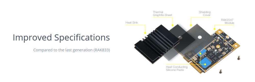The RAK2247 is the evolution of the RAK833. It keeps the same small form factor (mPCIE) and is just as easy to integrate as the previous model, but it features a number of improvements.