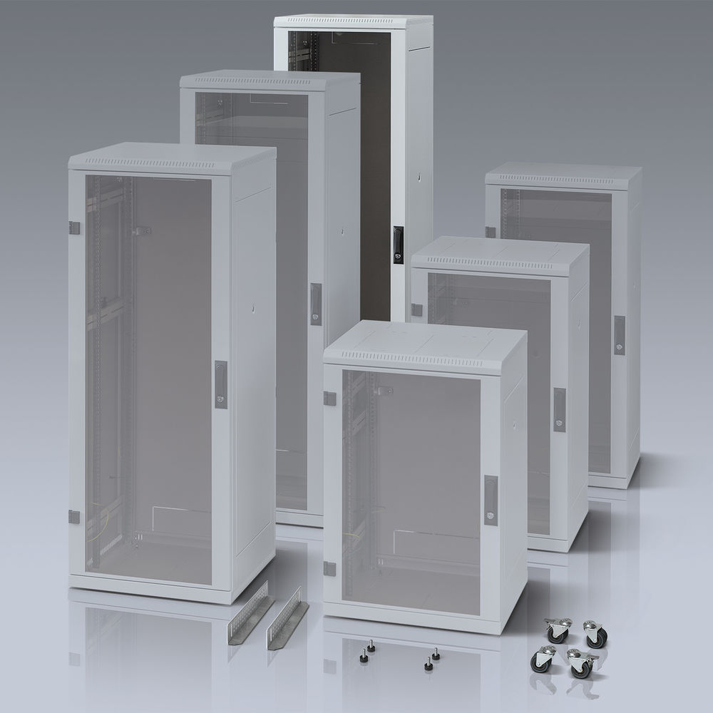 As with all RVP models, the RVP-042 complies with DIN 41494 standards for 19˝ equipment and features a fully welded, powder-coated steel housing. The cabinet comes standard with a lockable plexiglass door, removable side and rear panels, depth-adjustable vertical rails, and essential mounting accessories. Optional upgrades further enhance its cooling and load-bearing capabilities.
