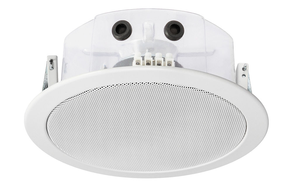 Its plastic-coated metal body and antistatic PET safety cover provide durability and user protection. Installation is quick and easy via spring-clamp mounting, compatible with ceiling thicknesses from 3 to 45 mm, and its shallow depth makes it suitable for limited space applications. The speaker is moisture-proof, temperature-resistant (-10 to +55 °C), and rated IP21C for splash protection.