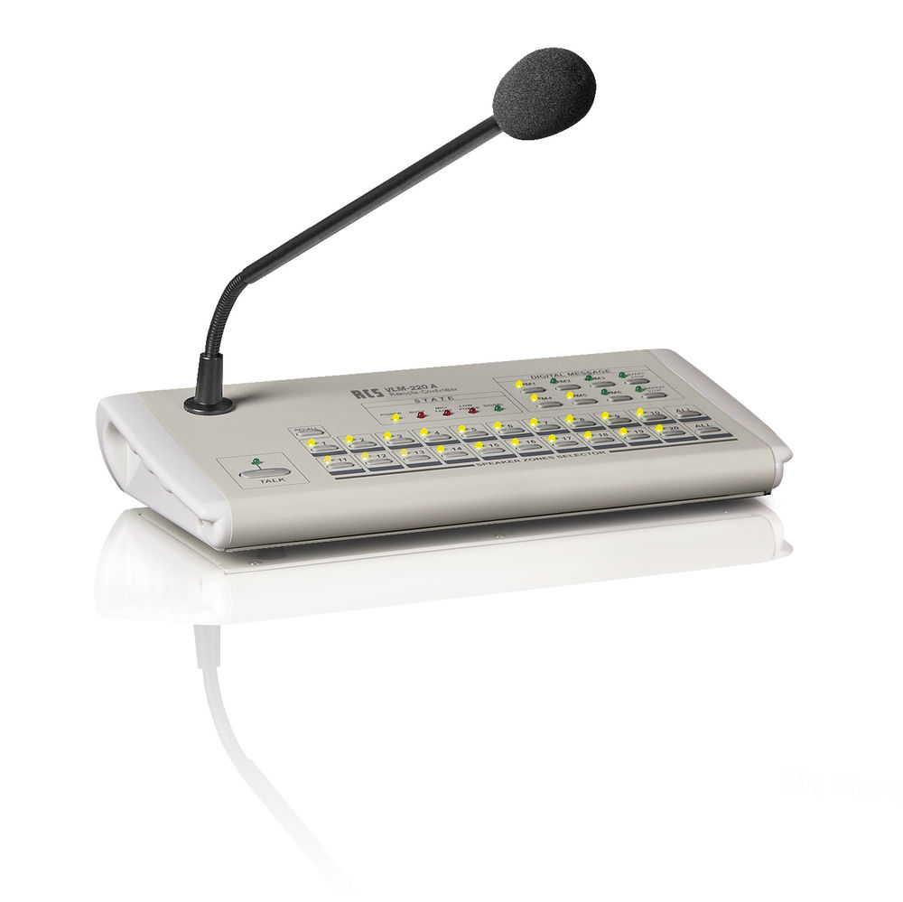 Each of the 20 zones can be individually selected, or an All-Call function can be used for simultaneous announcements. The VLM-220A includes dedicated zone buttons with LED status indicators, a trigger button for pre-recorded messages, and a high-quality gooseneck microphone. Communication is fully digital via system bus, ensuring reliability and ease of installation.