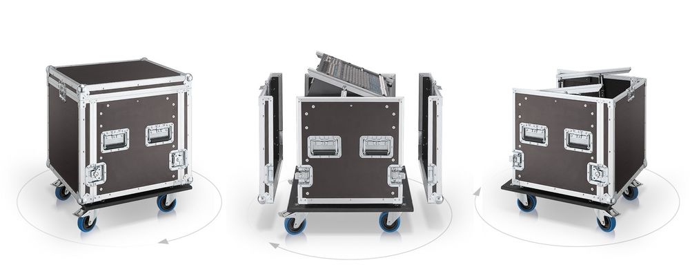 The case body is constructed from 7 mm multi-layer birch plywood in Double Door design. Durable 25/25 mm aluminum edge profiles and chrome-plated steel ball corners provide exceptional protection. The tiltable top-mounted 48,3 cm ( 19 inch ) rack rail is perfect for mixer positioning and intuitive control access.