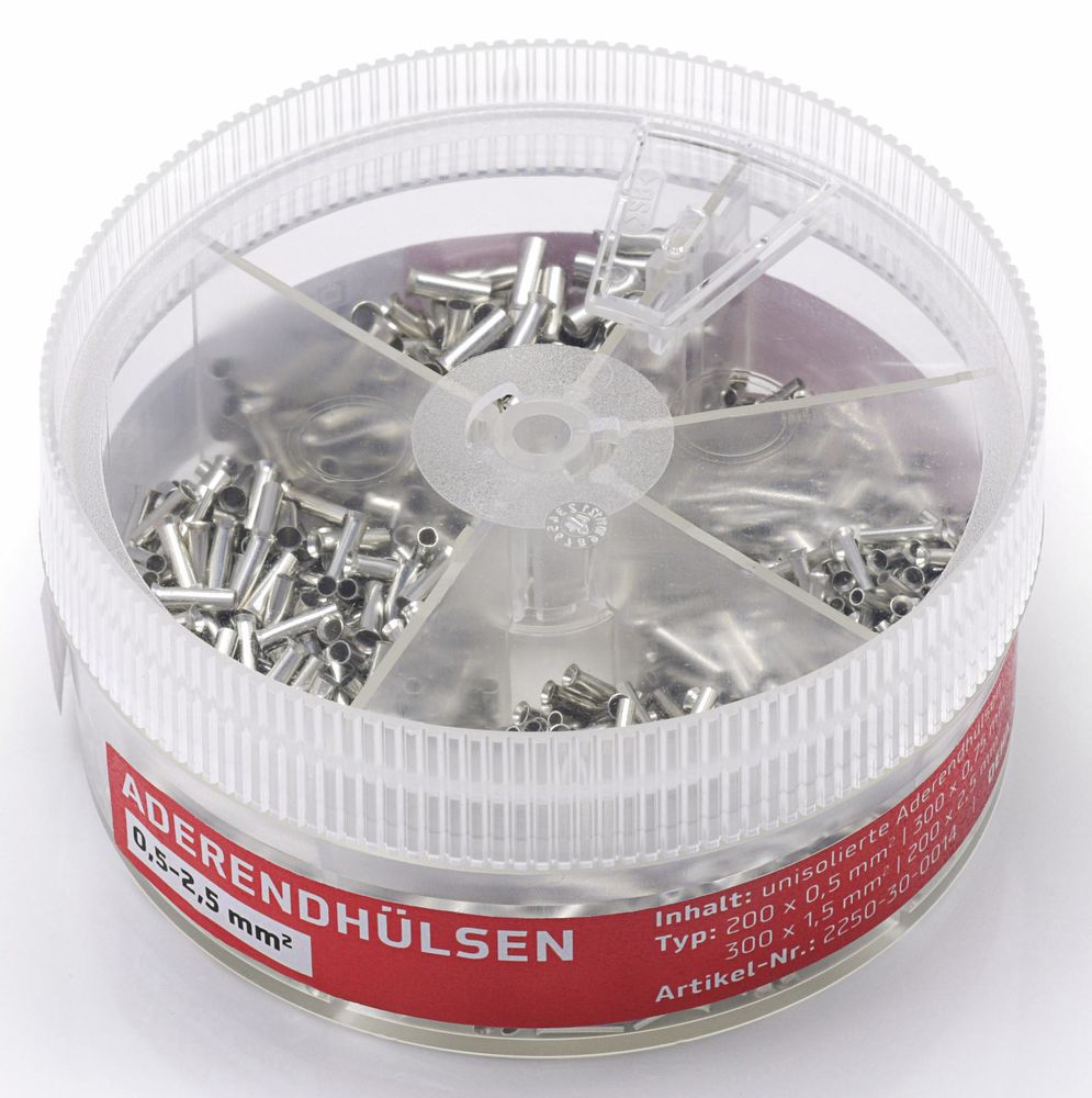 The handy, portable tin made of polystyrene is equipped with a practical and secure screw cap. The uninsulated wire end ferrules guarantee an optimal electrical connection between the conductor and the cable clamp as well as easy installation. Burr-free version with a length of 8 mm, with expansion, for the simplest and splice-free cable entry. Material: The metal sleeve is made of electrolytic copper (E-CU), in a galvanically pure tin-plated version for the highest possible corrosion protection. Extreme temperature resistance for control cabinet ambient conditions up to 105 °C. The dimensions of the wire end ferrules correspond to DIN 46228-1.