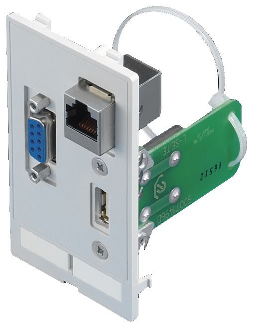 Design: Interface inserts USB A (jack/jack), RJ 45 (jack/jack, Cat. 5e), SUB-D9 (jack/pin)