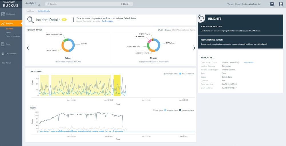 Comprehensive reports, informative dashboards and computer-assisted analysis for RUCKUS enterprise networks.