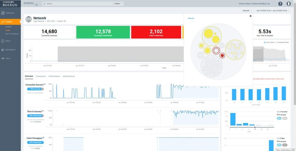 The service allows you to easily monitor network health with a clear overview tab that provides a high-level summary view. Select other health monitoring tabs to view metrics in specific health categories: connection, performance, and infrastructure. Network health monitoring gives you instant insight into metrics such as AP service uptime, time to connection, connection success rate, client throughput, and more. You define the service levels by which you want to be measured. For example, you can set the Time to connect goal to five seconds - RUCKUS Analytics tells you what percentage of the time the network reaches this goal. With this service, you can not only monitor the performance of SLAs, but also demonstrate them to your company's employees.