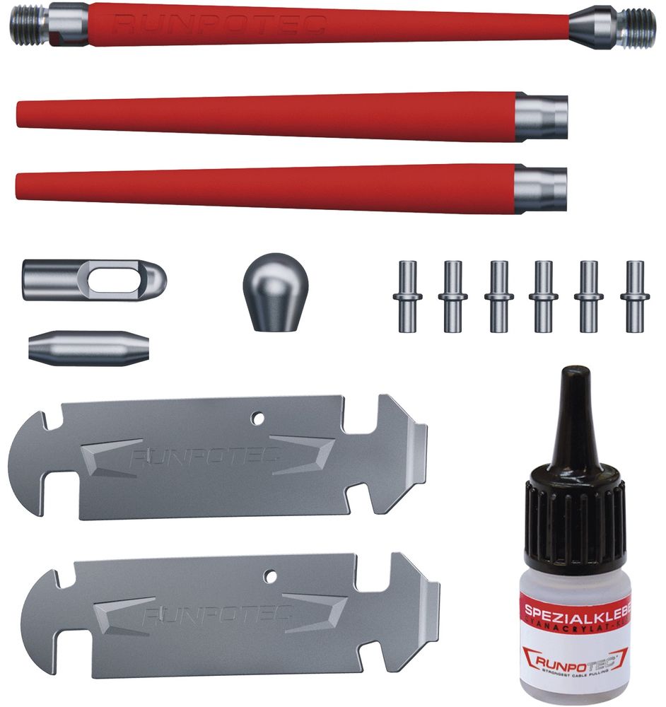 Scope of delivery: 1 x guide tip with twist compensation, 2 x kink protection, 1 x special adhesive 3 g, 2 x assembly key, 1 x towing eye Ø 7 mm, 6 x adhesive sleeves (brass), 1 x connecting sleeve, 1 x starting bulb Ø 11 mm