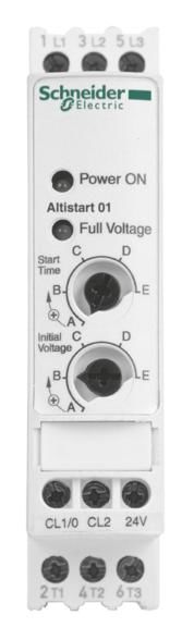 The starter allows the soft start AC motors and prevents current peaks in the startup phase and mechanical load surges. Easy start, By-pass integrated, optional alarm outputs or control voltage internally or externally, boost function for high starting torque. Altistart 01 soft start 110 .. 480 V, 3-phase AC, 50/60 Hz, internal control voltage, single-ph. Driving motor 230 V power: 0.75 kW motor 400 V power: 2.2 kW Rated current IU: 6 A Type: ATS01N106FT
