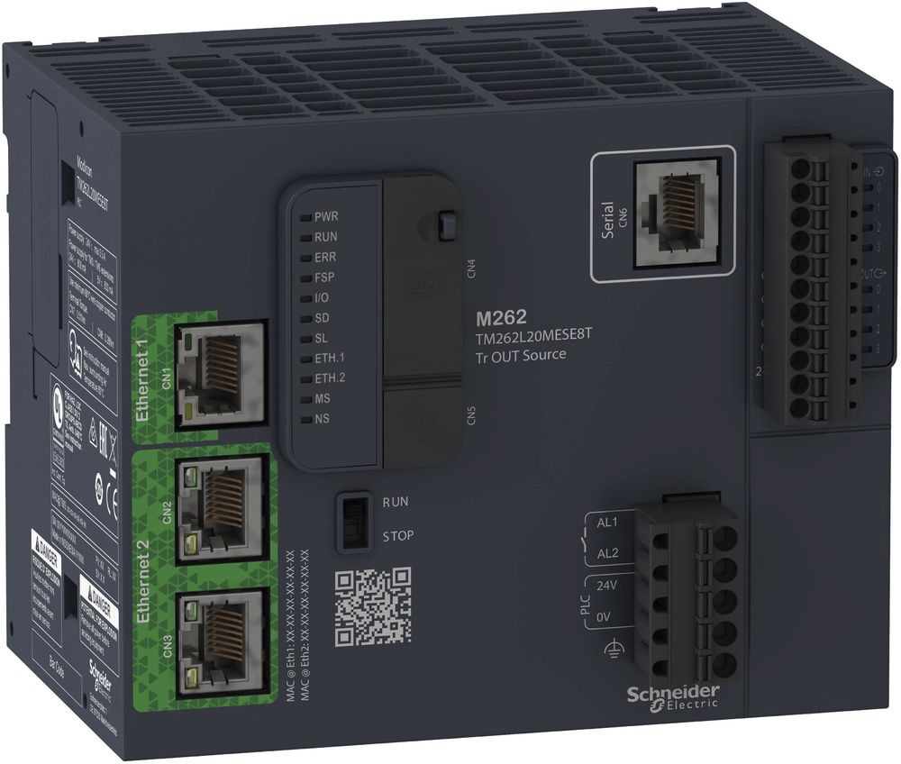 IIoT-capable Modicon M262 PLC controller with 3ns / Boolean instruction for the automation of industrial machines with high demands on performance and connectivity. Highly networkable thanks to supported cloud protocols (MQTTs, HTTPs, OPC UA) and data formats (JSON). At the same time protected by comprehensive cybersecurity and encrypted communication (TLS). Implementation of complex communication structures with secure network segmentation thanks to up to 5 separate Ethernet ports (2 integrated, expandable to 3 with TMSES4) with their own MAC address and their own IP address space. A switched Ethernet dual-port switch (1Gbit/s) with RJ45 sockets for daisy chain and RSTP, an Ethernet port (100Mbit/s) Ethernet/IP and Modbus/TCP. Available Ethernet services MQTTs, OPC UA Server/Client, HTTPs Methods (API), DHCP Client/Server, DNS Client, POP3s Client, RSTP, SMTPs. SNMP Agent/Manager, SNTP, NTP Client/Server, SQL remote access, webserver, Webvisu. An isolated RS485/RS232 interface with RJ45 socket for Modbus SL (ASCII/RTU) Master/Slave, ASCII character string. A total of 8 fast digital I/Os (4 inputs with 20 µs / 4 outputs with 3 µs). The power supply is via 24VDC. 192MB integrated RAM memory and 256MB flash memory. Equipped with a slot for µSD card, a USB-B port for programming, a run/stop switch, real-time clock and QR code with device ID and link to technical documentation. Local and decentralized I/O expansion with Modicon TM3/TM5 I/O system. Programming and configuration using EcoStruxure Machine Expert software (download from www.se.com). PLC programming in accordance with IEC 61131-3 in the programming languages structured text (ST), function block diagram (FBD/CFC), instruction list (AWL), ladder diagram (LD) or sequential function chart (SFC) based on CODESYS V3. Connection via removable spring-loaded terminal blocks. Ambient temperature during operation -20°C to +60°C. Mounting on 35mm DIN rail or directly on control panel with optional holder. Certifications in accordance with CE, cULus, cULus HazLoc Class I, RCM, EAC, Achilles L2, EU RO Mutual (Marine certification), OPC Foundation.