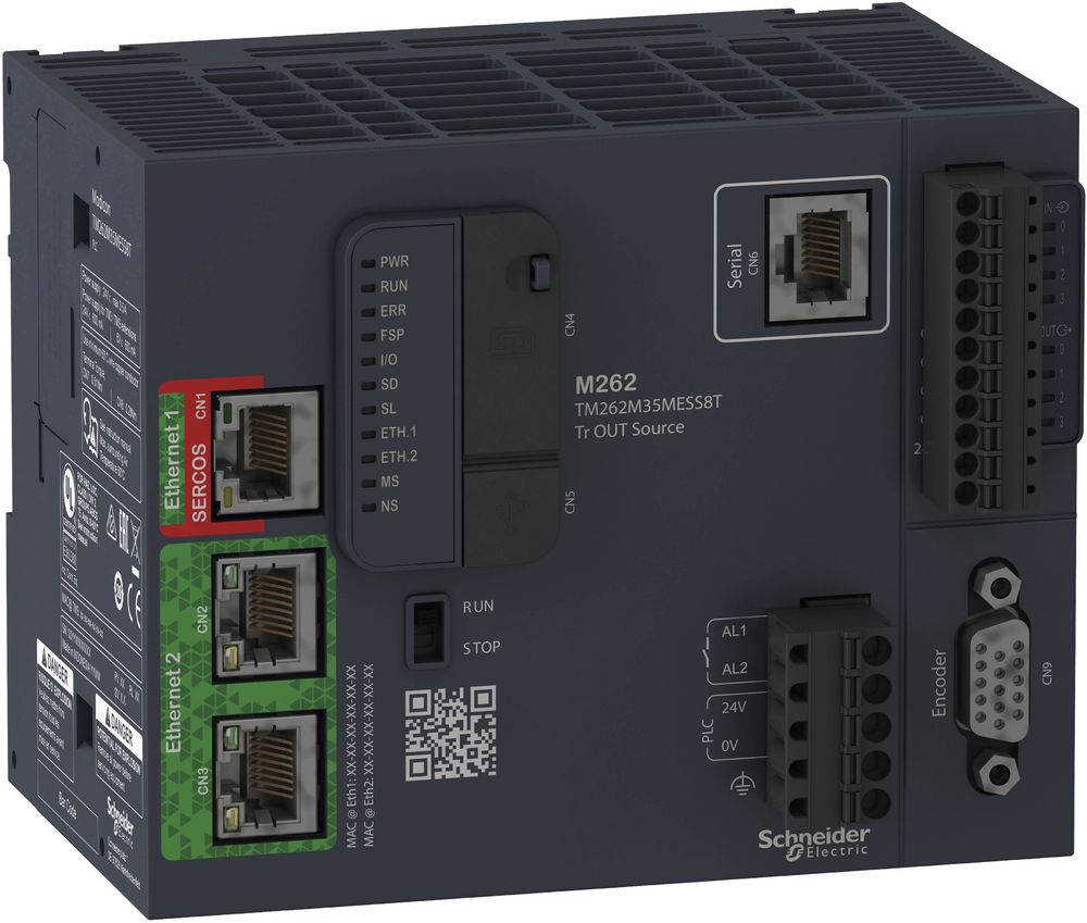 Modicon M262 PLC/motion controller with 5ns/boolean instruction and up to 24 synchronous axes for industrial machines with high demands on performance and connectivity. Highly networkable thanks to supported cloud protocols (MQTTs, HTTPs, OPC UA) and data formats (JSON). At the same time protected by comprehensive cybersecurity and encrypted communication (TLS). Implementation of complex communication structures with secure network segmentation thanks to up to 5 separate Ethernet ports (2 integrated, expandable to 3 with TMSES4) with their own MAC address and their own IP address space. Up to 24 synchronous axes in 4ms. Extensive motion control functions such as camming and gearing, 3D/G-code editor and DXF import, CNC library and editors, p2p robotics (up to 3 axes). A switched Ethernet dual-port switch (1Gbit/s) with RJ45 sockets for Ethernet/IP and Modbus/TCP for daisy chain and RSTP, an Ethernet port (100Mbit/s) with additional SERCOS III real-time bus. Available Ethernet services MQTTs, OPC UA Server/Client, HTTPs Methods (API), DHCP Client/Server, DNS Client, POP3s Client, RSTP, SMTPs. SNMP Agent/Manager, SNTP, NTP Client/Server, SQL remote access, web server, web visualization. An isolated RS485/RS232 interface with RJ45 socket for Modbus SL (ASCII/RTU) master/slave, ASCII character string. A total of 8 fast digital I/Os (4 inputs with 20 µs / 4 outputs with 3 µs), an integrated and configurable encoder input (SSI or incremental) with up to 200 kHz. The power supply is via 24VDC. 192MB integrated RAM memory and 256MB flash memory. Equipped with a slot for µSD card, a USB-B port for programming, a run/stop switch, real-time clock and QR code with device ID and link to technical documentation. Local and decentralized I/O expansion with Modicon TM3/TM5/TM7 I/O system. Integrated safety by means of expansion with safety PLC (SLC). Programming and configuration using EcoStruxure Machine Expert software (download from www.se.com). PLC programming in accordance with IEC 61131-3 in the programming languages structured text (ST), function block diagram (FBD/CFC), instruction list (AWL), ladder diagram (LD) or sequential function chart (SFC) based on CODESYS V3. Connection via removable spring-loaded terminal blocks. Ambient temperature during operation -20°C to +60°C. Installation on 35mm DIN rail or directly on control panel with optional holder. Certifications in accordance with CE, cULus, cULus HazLoc Class I, RCM, EAC, Achilles L2, EU RO Mutual (Marine certification), OPC Foundation.