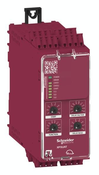 The Harmony XPS Universal safety relays are ideal for use in a variety of safety applications thanks to their selectable safety function and start option using rotary switches on the front. This reduces the number of variants of the devices required and the diagnostic function allows states to be easily transferred to a PLC, so that in the event of a fault, downtimes are reduced by clear error information. The required function can be easily set from 10 selectable safety functions. Mechanical contacts from emergency stop/stop buttons, position or magnetic switches, safety mats as well as electronic PNP/NPN sensors, light curtains or RFID safety switches with OSSD outputs can be connected to the inputs. A safety function can be operated via the two inputs in a two-channel (redundant) version. Automatic, manual or monitored start as well as an optional start-up test are available for the start function. This safety switching device has 3 safe, undelayed relay contacts as output and optionally 3 safe, delayed contacts, 1 break contact and 1 semiconductor signal output, as well as 1 diagnostic message. The switch-off delayed time functions (e.g. stop category 1 or 2, SS1 or SS2) can be set in steps from 0.1 second to 15 minutes. With the help of the qualified diagnostics, states and errors are detected and transmitted to a standard input of a PLC using a telegram via direct wiring. A ready-made function block for common control systems evaluates these messages so that the operator is comprehensively informed on the machine display. The supply voltage is 48-240 VAC/DC and the connections are made via removable spring-loaded terminals. Applications up to safety level PL e in category 4 or SIL3 can be realized. If the number of outputs needs to be increased, the XPSUEP extension can simply be connected to the side via an integrated connector, saving time by eliminating cross-wiring. Installation is done by snapping it onto a top hat rail or screwing it onto mounting plates. A uniquely numbered locking strap is included to protect the settings under the transparent cover. A wide range of approvals enable international use. Thanks to the Green Premium eco-label, you can obtain detailed information on material content, environmental impact and circular economy that supports your sustainability goals.