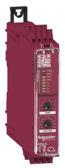 The Harmony XPS Universal safety relays are ideal for use in a variety of safety applications thanks to their selectable safety function and start option using rotary switches on the front. This reduces the variety of devices required and the diagnostic function allows states to be easily transferred to a PLC, so that in the event of a fault, downtime is reduced by clear error information. The required function can be easily set from 10 selectable safety functions. Mechanical contacts from emergency stop/stop buttons, position, magnetic, enabling switches, two-hand operation type IIIC, PNP sensors, light curtains or RFID safety switches with OSSD outputs can be connected to the inputs. A safety function can be operated via the 4 inputs in 2x two-channel (redundant) versions. Automatic, manual or monitored start as well as an optional start-up test are available for the start function. This safety switching device has 2 safe relay normally open contacts and 1 diagnostic message as outputs. With the help of qualified diagnostics, states and errors are detected and transmitted to a standard PLC input using a telegram via direct wiring. A prefabricated function block for common control systems evaluates these messages so that the operator is comprehensively informed on the machine display. The supply voltage is 24 VAC/DC and the connections are made via removable spring-loaded terminals. Applications up to safety level PL e in category 4 or SIL3 can be realized. If the number of outputs is to be increased, the XPSUEP extension can simply be connected to the side via an integrated connector and cross-wiring can be dispensed with, saving time. Installation is carried out by snapping it onto a top-hat rail or screwing it onto mounting plates. A uniquely numbered locking strap is included to protect the settings under the transparent cover. A wide range of approvals enable international use. Thanks to the Green Premium environmental label, you can receive detailed information on material content, environmental impact and circular economy that supports your sustainability goals.