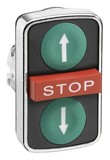 Schneider triple pushbutton arrow up gn STOP rt vorst. Down arrow.