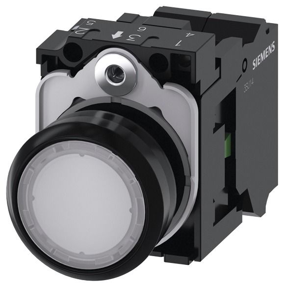 Illuminated pushbutton, 22 mm, round, plastic, white, pushbutton, flat, momentary, with holder, 1S, LED module with integrated LED AC/DC 24V, spring-loaded connection Illuminated pushbutton SIRIUS ACT for switching and controlling electrical consumers.Under the brand name SIRIUS ACT, Siemens offers a unique portfolio of command and signaling devices with worldwide product approvals in three modern design series made of robust real metal and high-quality plastic.The innovative snap-on concept simplifies assembly to such an extent that only one hand and no special tools are required. Groove-free holes are sufficient for mounting holes, as 100% anti-twist protection is already integrated.Thanks to the consistently high degree of protection, the robust devices are suitable for industrial use and outdoor use. Cleaning with a high-pressure jet is even possible. Neither dust, oils nor aggressive alkalis can interfere with reliable operation.In addition to the standard wiring, most devices can also be connected to the controller via PROFINET, AS-Interface or IO-Link. This reduces your wiring effort, minimizes sources of error and gives you more flexibility.The graphic online configurator provides convenient support when selecting and ordering individual devices, housings and labels. Comprehensive documentation (e.g. manual, 3D data, connection diagram) is available.Available versions: several colors, illuminated/non-illuminated, with/without labeling, latching/momentary actuation, various pushbutton and front ring heights.Note: Complete device, delivery includes holder and modules.SIRIUS ACT - Performance in Action when commanding and reporting. Simply installed, simply strong, simply perfect.