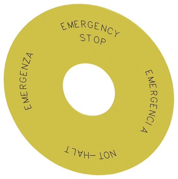 Siemens 3SU19000BC310NB0 name plate, round yellow emergency stop 4 languages