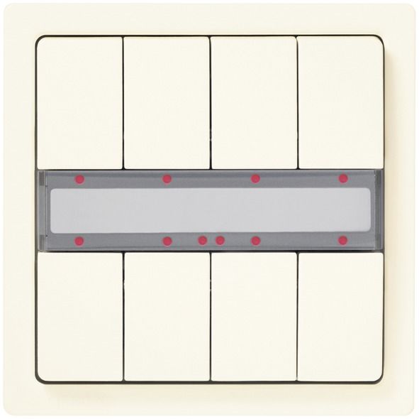 with selectable function for each status LED: LED permanently off, LED permanently on, LED indicates key operation, LED indicates long key press, LED on / off / flashing (slow, medium, fast) depending on binary value (on or off), LED on / off / flashing (slow, medium, fast) depending on analog value (8-bit value, percentage value, 16-bit value, temperature value, brightness value), with an LED for orientation light,