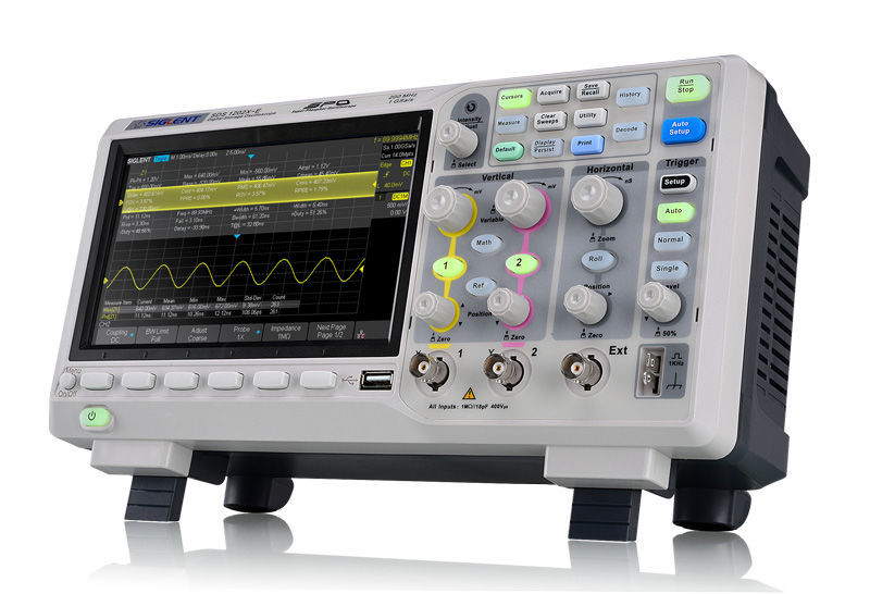 SDS1204X-E Bandwidth 200 MHz 100 MHz 200 MHz Sampling rate (max.) 1 GSa 1 GSa 1 GSa Signal acquisition rate 100000 wfms/s 100000 wfms/s 100000 wfms/s Memory deep 14 MPts 14 MPts 14 MPts Screen 17.78 cm / 7 inch (800x480) 17.78 cm / 7 inch (800x480) 17.78 cm / 7 inch (800x480) Channels 2 4 4 FFT support points 1 MPts 1 MPts 1 MPts Function generator No chargeable Paid option Logic analyzer option No Paid option Paid option Serial decoders Included Included Included
