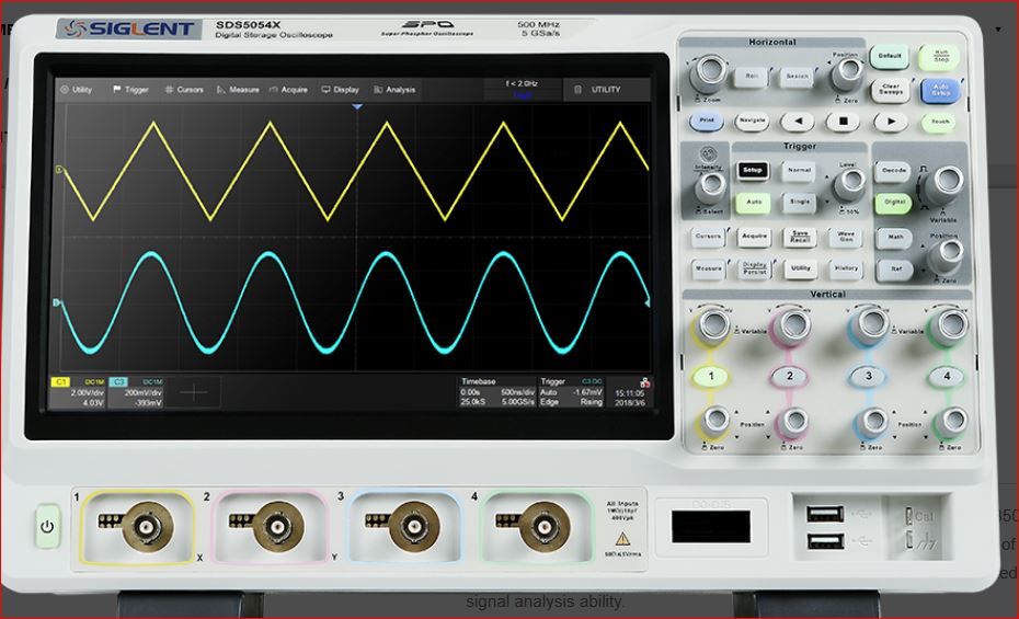 oscilloscope / The SDS5034X oscilloscope from Siglent has a bandwidth of 350 MHz and 4 analog channels