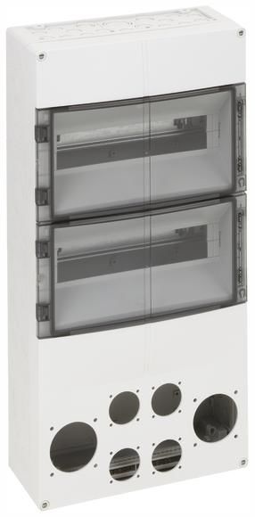 Openings for sockets:, Modular devices: max. 12TE, 4x SCHUKO(R) socket (front) 16A, 230V, 2x holes for CEE socket with diameter 66.5mm and hole spacing for vertical / horizontal mounting of 60/60mm (front) Dimensions: 300 x 600 x 142mmIncluded accessories: Double membrane nozzle: 1x M20, 1x M25, 1x M32, mounting nozzle: 1x M40, sealing plug, cover and labeling strips