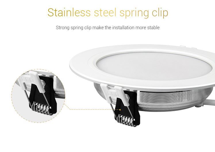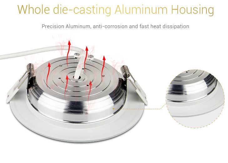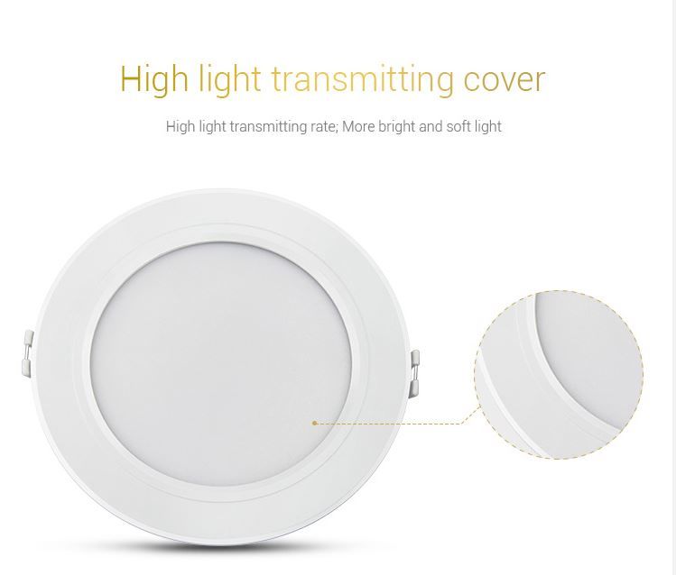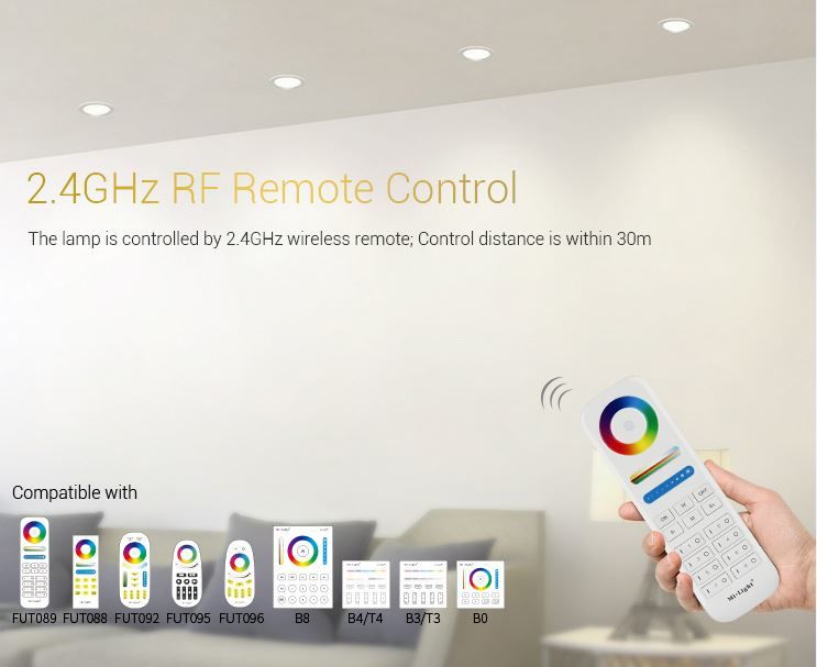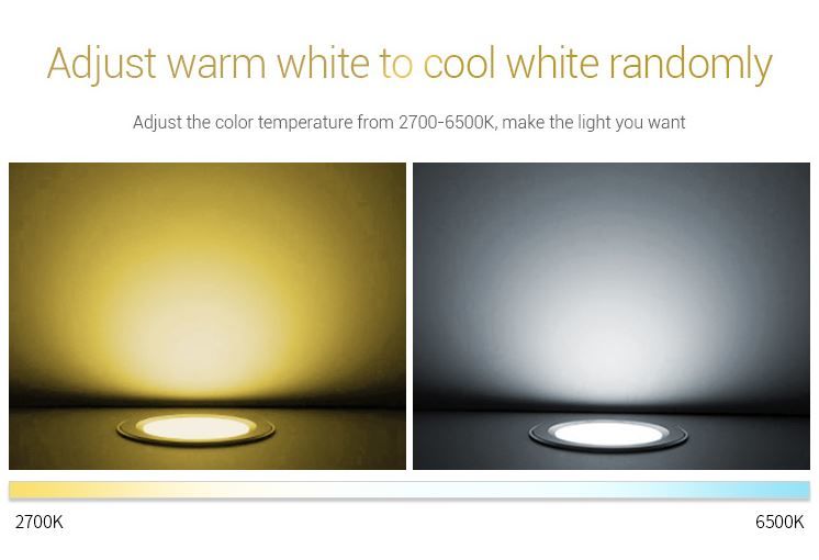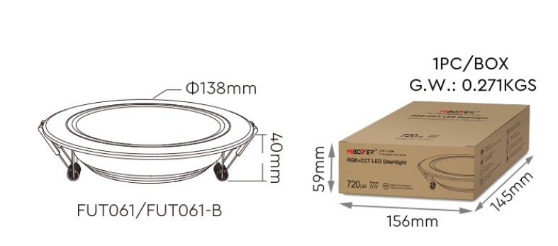Product Name: 9W RGB+CCT LED downlight Model No.: FUT061 Power: 9W input Voltage: AC100~240V 50/60Hz Color temperature: 2700K~6500K Luminous Flux: 720LM Light Efficiency: 80LM/W CRI:>80 PF: >0.5 Lifespan: 50000 hours Beam Angle: 120° Control Distance:30m HoIe Size: ø110~ 125mm Material: Aluminum